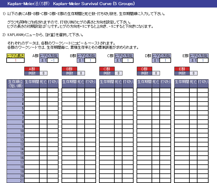 各群に生存期間と死亡数,打ち切り数を生存期間順に入力します。