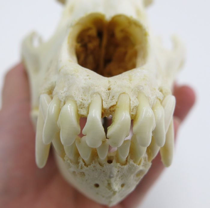 犬の頭蓋骨標本。下顎は金属製のバネで接続されており,動かすことが可能です。