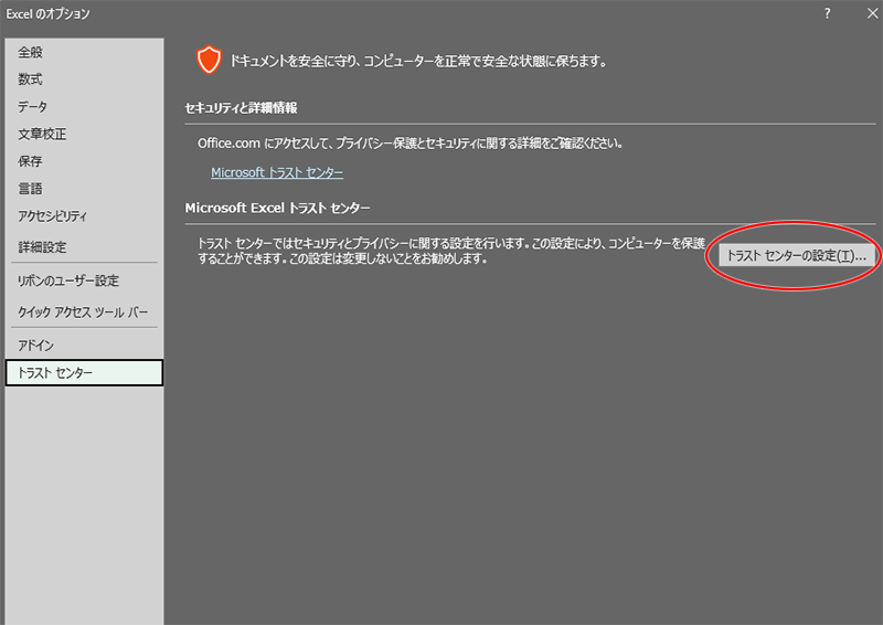 オプション画面、左メニューバー最下部にある「トラストセンター」を開きます