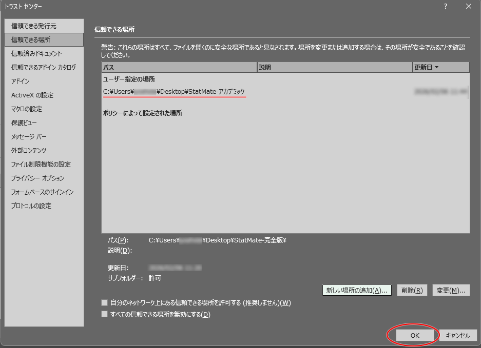 「信頼できる場所」ウィンドウに戻るので、StateMeteが追加されていることを確認してOK