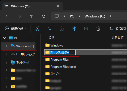 - 「新しいフォルダー」が作成されるので、扱いやすい名称を付ける