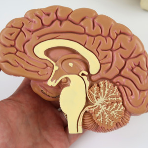 様々な疾患を示した実物大の脳モデルです。右脳は正常な状態を示し,左脳は3つに分解可能で病的な状態が示されています。以下の状態を確認できます。アルコール依存症,アルツハイマー病,うつ病やけいれん関連の腫瘍,偏頭痛,多発性硬化症,パーキンソン病,脳卒中,硬膜下血腫。ウイリス動脈輪では動脈瘤を確認できます。脳モデルは頭蓋骨に収められており,頭蓋冠,下顎骨はありません。
