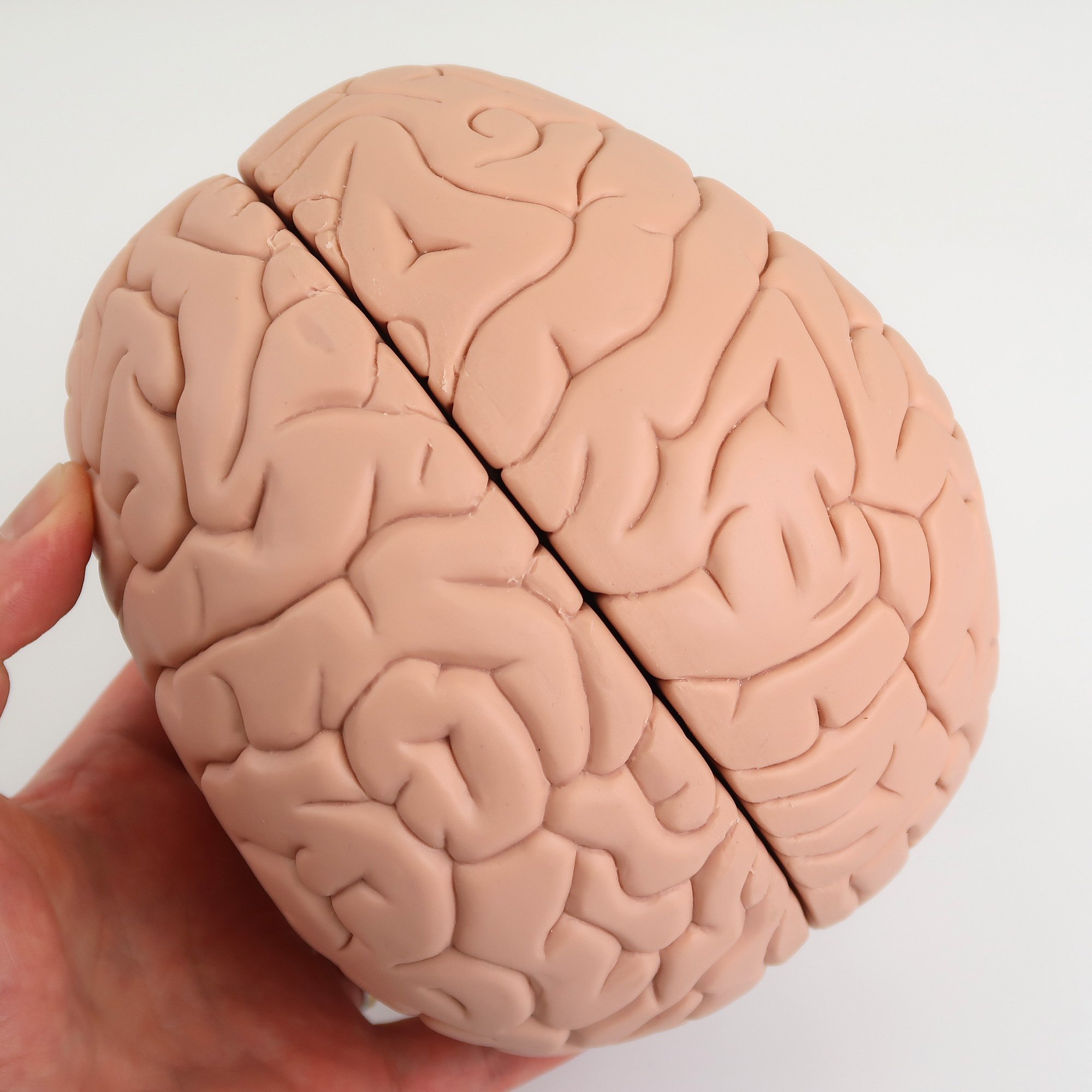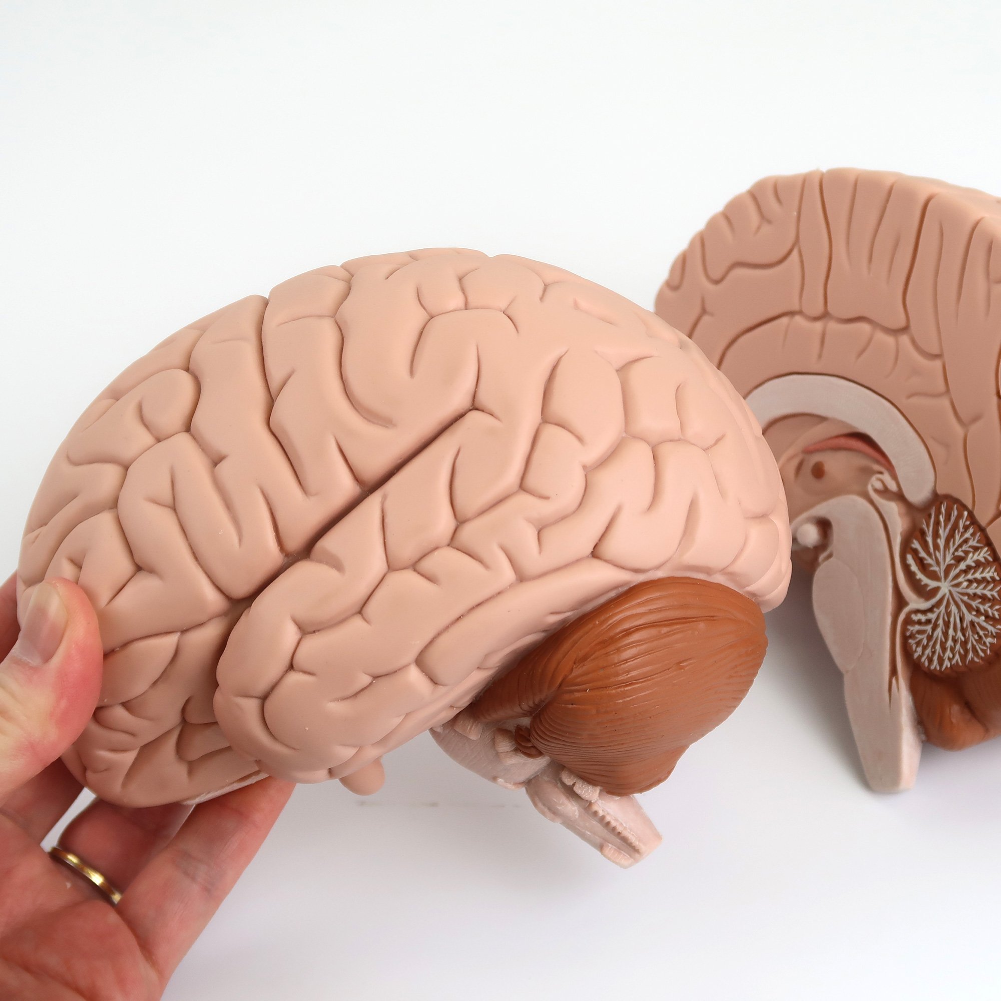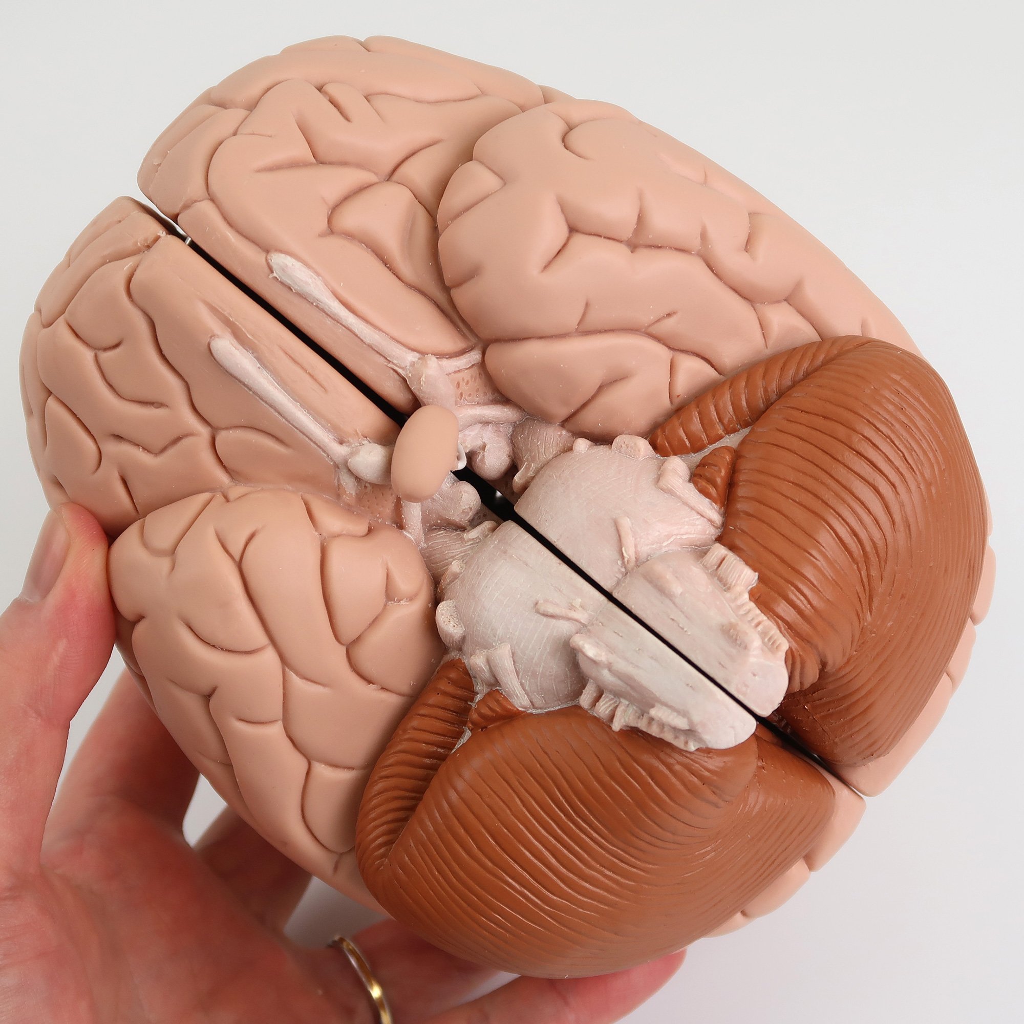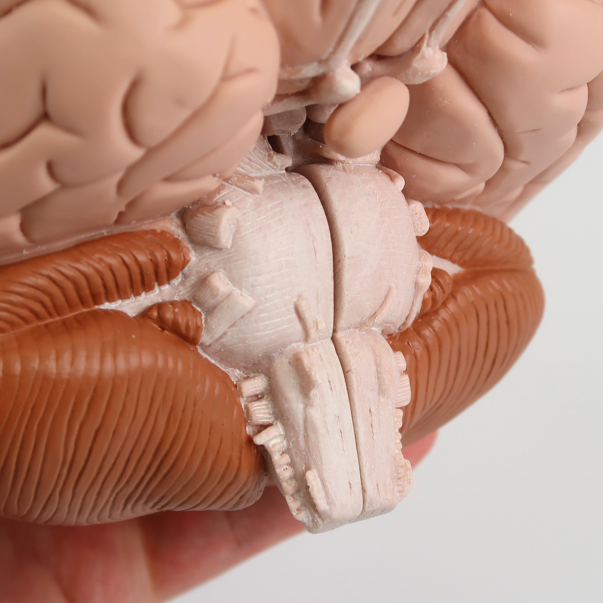 正中矢状断からの2分解モデル。部分的に着色されており脳梁,小脳などを確認できます。スタンド付。