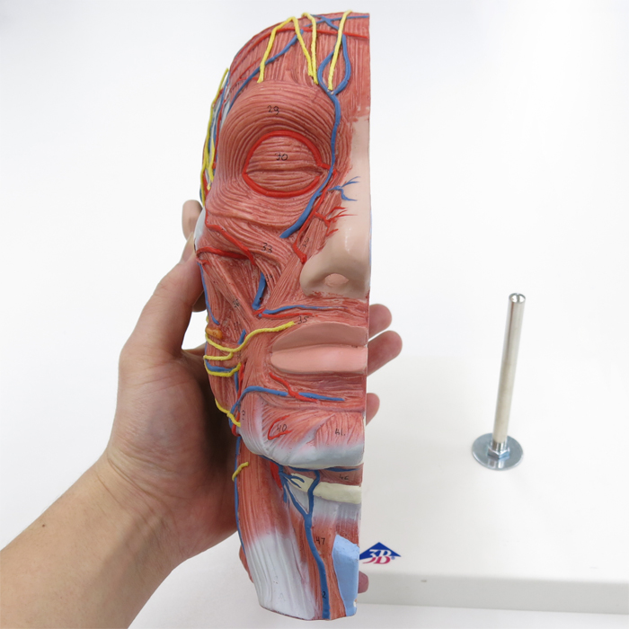 頭部を正中断した半頭モデル。頭部と頚部の浅層,深層,断面の構造を表示しています。スタンド付。