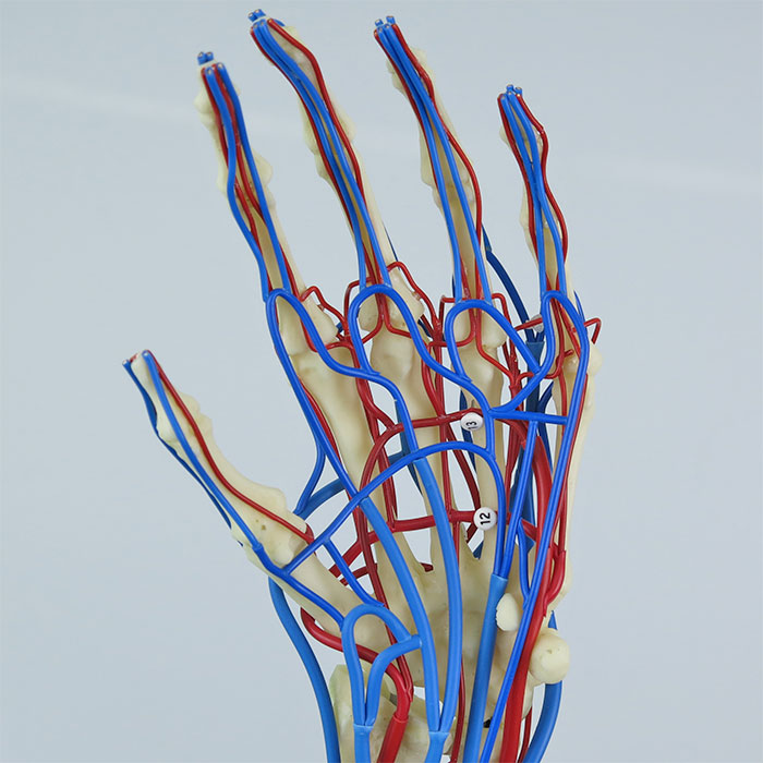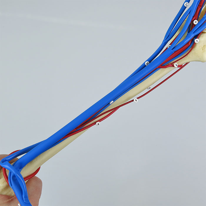 肘関節をやや屈曲した左上肢の骨格に,上腕動脈,橈骨動脈,尺骨動脈,および周辺の静脈を加え,上肢の血管の走行を分かり易く示した実物大モデルです。各血管の相対的な径の差も実物どおりに表しています。スタンド付。