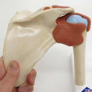 靭帯付可動型。肩関節の機能を実証できます。肩甲骨,鎖骨,上腕骨上部から構成され,関節面は青で着色されています。また骨表面の着色により骨の質感を再現しています。台座付。