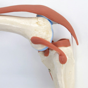 高品質の等身大機能モデルは靭帯が付属しており,関節の動き(外転,内転,内旋,外旋,水平伸展,水平屈曲,伸展,屈曲等)を忠実に再現することができます。ナチュラルキャストなので外観は極めて実物に近く,関節面は青く着色されています。台座付。