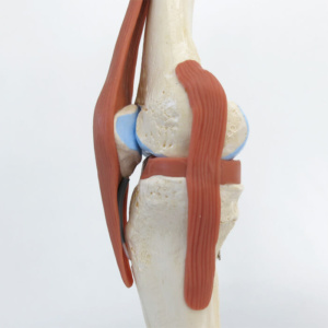 靭帯付可動型。膝関節の機能を実証できます。大腿骨下部,腓骨,脛骨,膝蓋骨から構成され,関節面は青で着色されています。また骨表面の着色で骨の質感を再現しています。台座付。