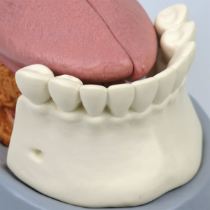 第2小臼歯までの下顎と,正中分割できる舌と口腔底の筋,右側の舌下腺と顎下腺を表示しています。台座付。