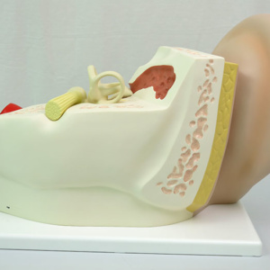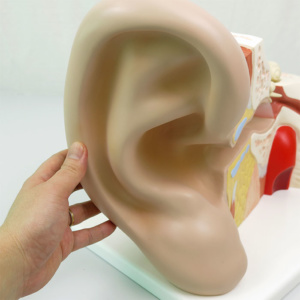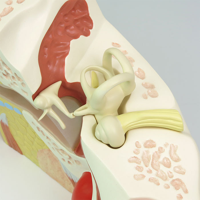 教室のどこからでも外耳,中耳,内耳をはっきりと見ることのできる大きなサイズのモデルです。耳小骨と骨迷路(蝸牛,神経付)は取り外し可能です。台座付。