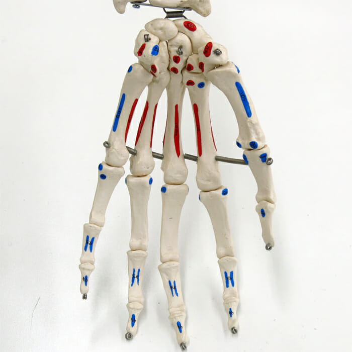 右上肢の肩関節・肘関節には伸縮可能な靭帯付きです。すべて個々に造形された手根骨・中手骨・指骨はワイヤーで連結され,位置関係も正確に再現されています。