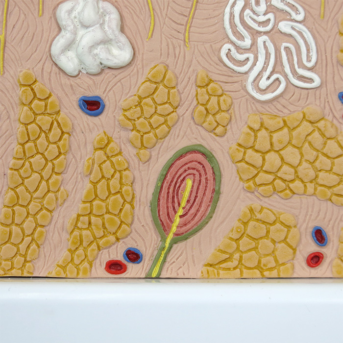 有毛部と無毛部の皮膚の断面を3層に分けて示したレリーフモデルです。毛根と脂腺,汗腺,小体,神経と血管などを表示しています。片手で扱えるサイズ。台座付。