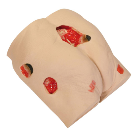 柔軟な実物に近い手触りの新素材を使用し74歳の患者から型を取った本製品は,見た目も手触りも本物そっくりで,多くの特徴を備えた褥瘡ケアのモデルです。皮膚の表面は粘着性がなく,包帯の適用と除去が容易におこなえます。