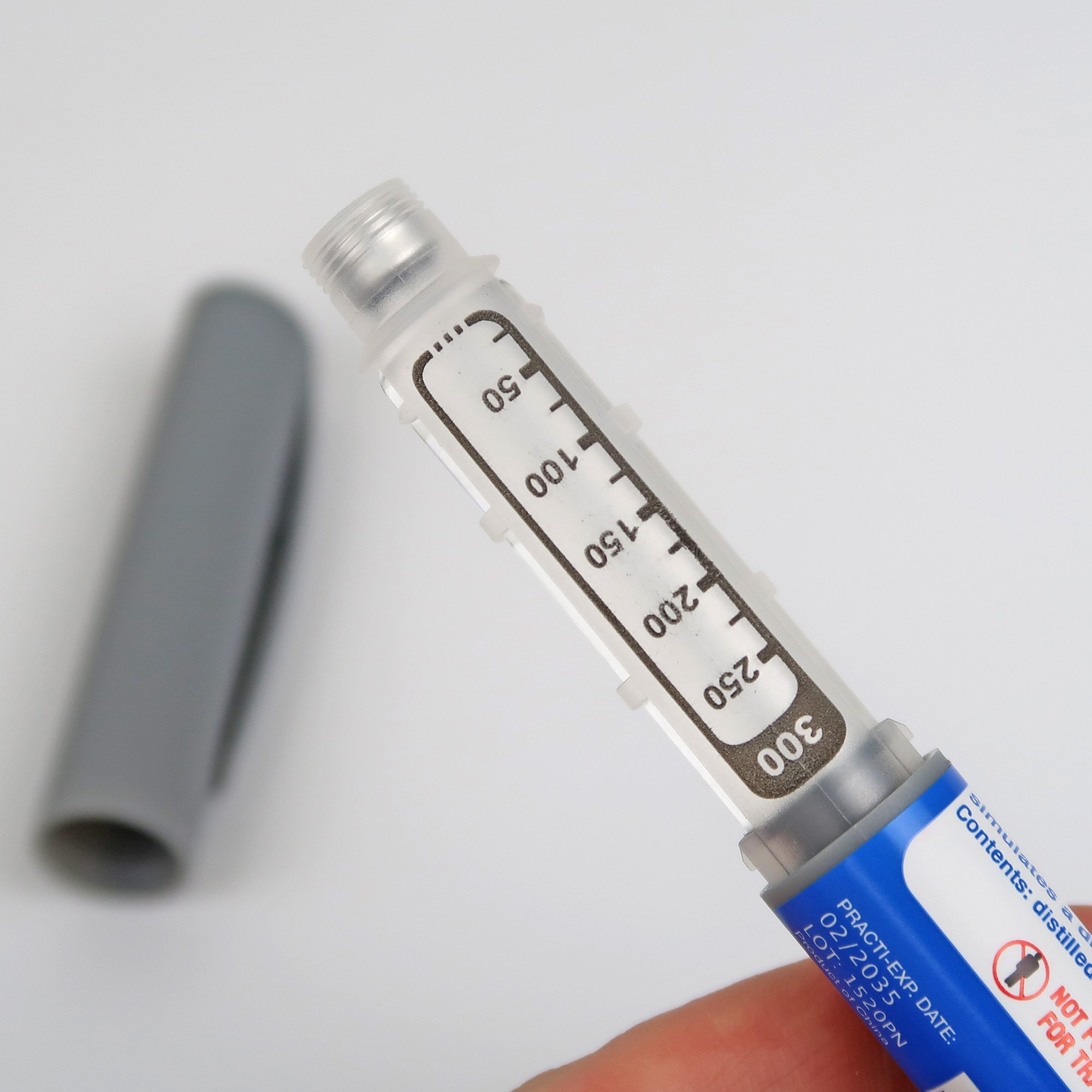 インスリンの標準的なペン型注入器を模したトレーニング器具で,投与量300単位分の容量を想定したサイズです。単位設定ダイヤルの操作ができます。針は付属していませんが,一般的なペン型注入器用の針を取り付けることができます。シミュレーショントレーニングでの利用の他,糖尿病の患者さんへの注入器の説明にも便利です。中は空で模擬薬は入っていません。
