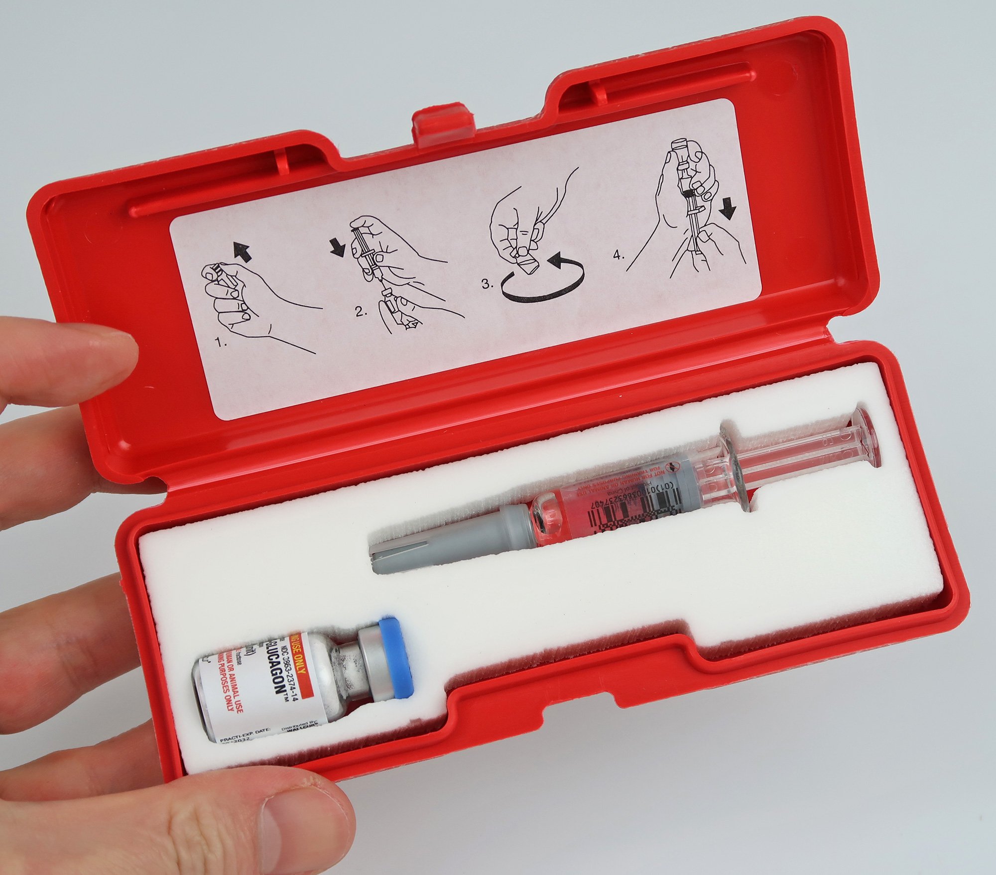 模擬溶解剤として蒸留水をあらかじめ入れたシリンジと、模擬グルカゴン粉末として果糖粉末を入れたバイアルが、専用ケースに納められキットです。特に、低血糖時の救急処置を想定したトレーニングに最適です。